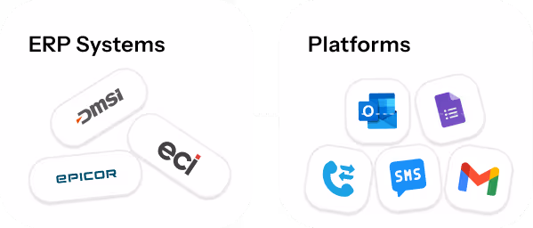 We are able to integrate with any industry ERP (e.g: Epicor, ECI, DMSI, Genetiq, Flitch, Ponderosa). We build a data feed and will automatically update our CRM based on your existing data.